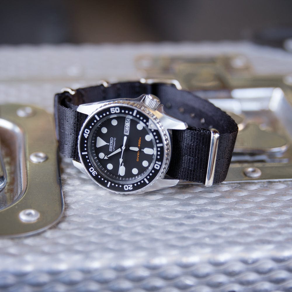 Made from premium seat belt-woven nylon, this military-inspired strap combines durability with comfort. Its solid construction features heavy-duty stitching and stainless steel hardware made to match your timepiece.