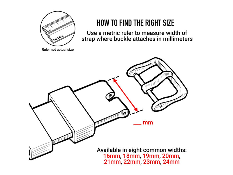 It's important to make sure you’ve got the correct size for a particular watch strap before ordering a buckle. Some straps are tapered so this is not always the same as the strap width. Using a metric ruler, simply measure the distance, in millimeters, of the width of the strap where it attaches to the buckle. That width is your buckle size.