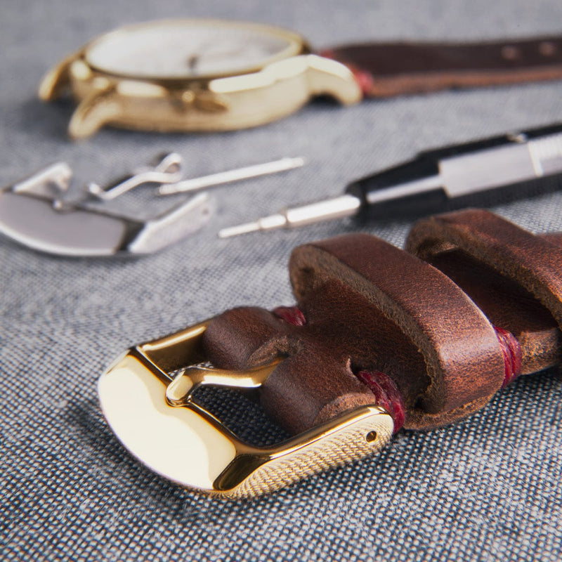 To install the buckle, use a pin or a spring bar tool to release the spring bar through the holes on the sides. Slot the spring bar into your strap and pop it back into the holes on the buckle.